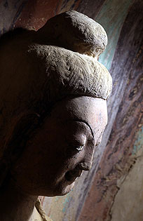 敦煌鳴沙山缺乏堅(jiān)硬的巖石,所以從一開始就是泥塑。北朝時(shí)期,敦煌泥塑塑像有釋迦佛、肋侍菩薩、釋迦苦修、禪僧等題材,造型上也受犍陀羅藝術(shù)的影響。但第259窟正龕的釋迦牟 尼和多寶佛,右壁龕上的被譽(yù)為“東方蒙娜麗莎”的單身坐佛,俯身向前,含著微笑;第248窟的彩塑坐佛,衣褶流動(dòng),唇角上翹,一手拂膝,一手做手印。它們都已有中國(guó)特色。到西魏時(shí)出現(xiàn)了秀骨清像風(fēng)格,北周后逐漸變得豐滿,到了隋唐就愈加圓潤(rùn)豐肥,形成了盛唐風(fēng)范。